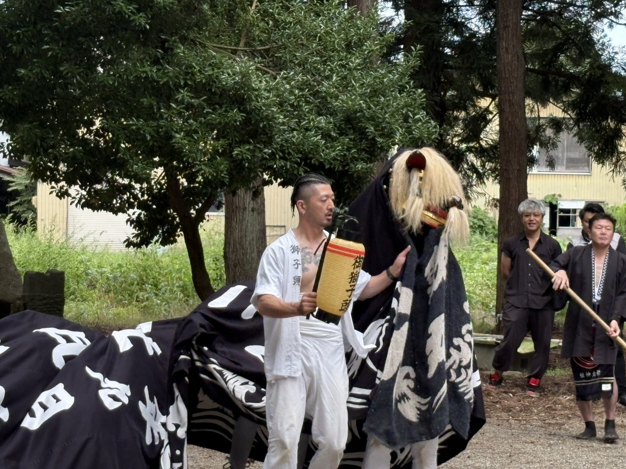 口を大きく開け、地面に顔が付くほどに反り返った後に歯で大きな音を出す「御信心(ごしんじん)」や警護に大きく寄り掛かる勇壮な「見返し」。大きく開けた口の中に杯ごとお神酒(みき)を頂く姿は、他では見られない特徴的な獅子舞い。