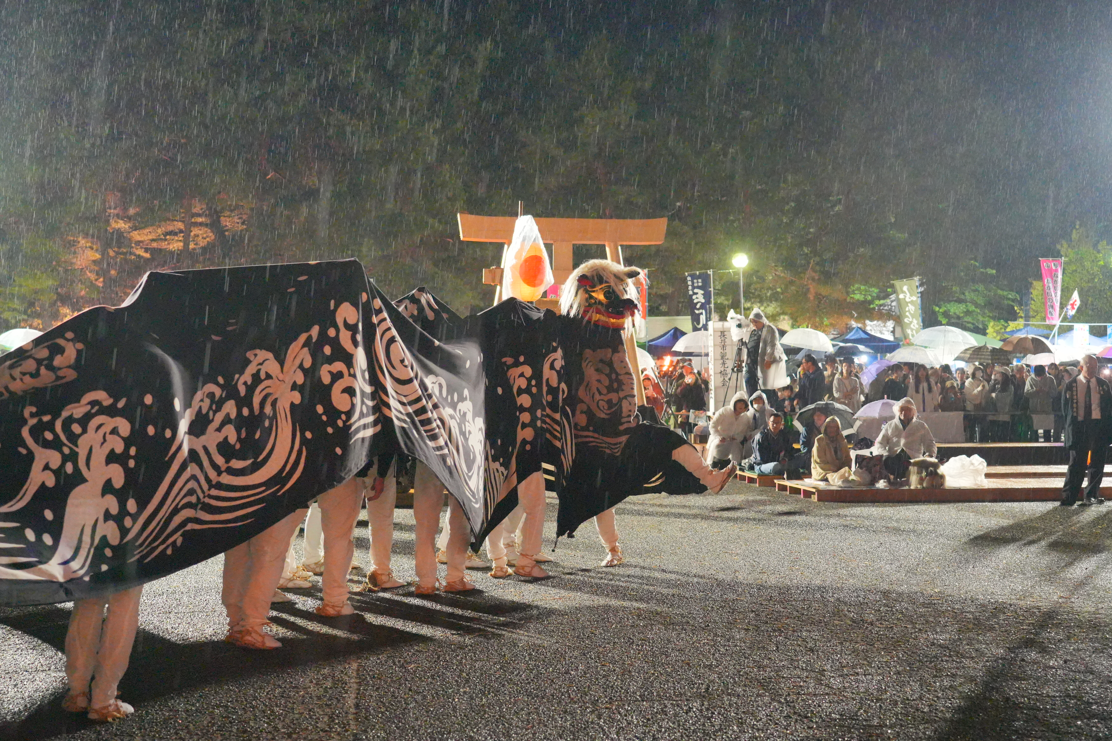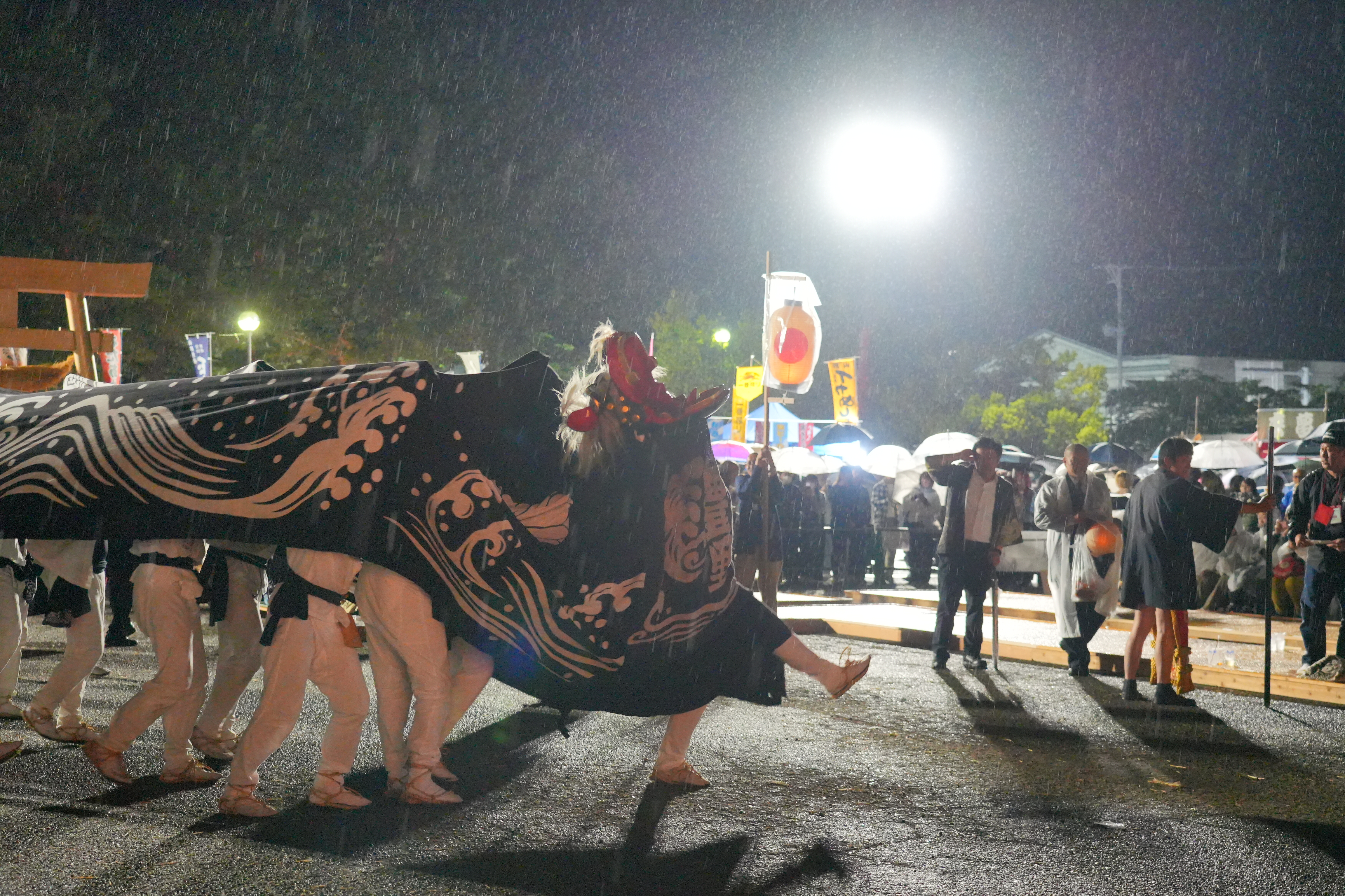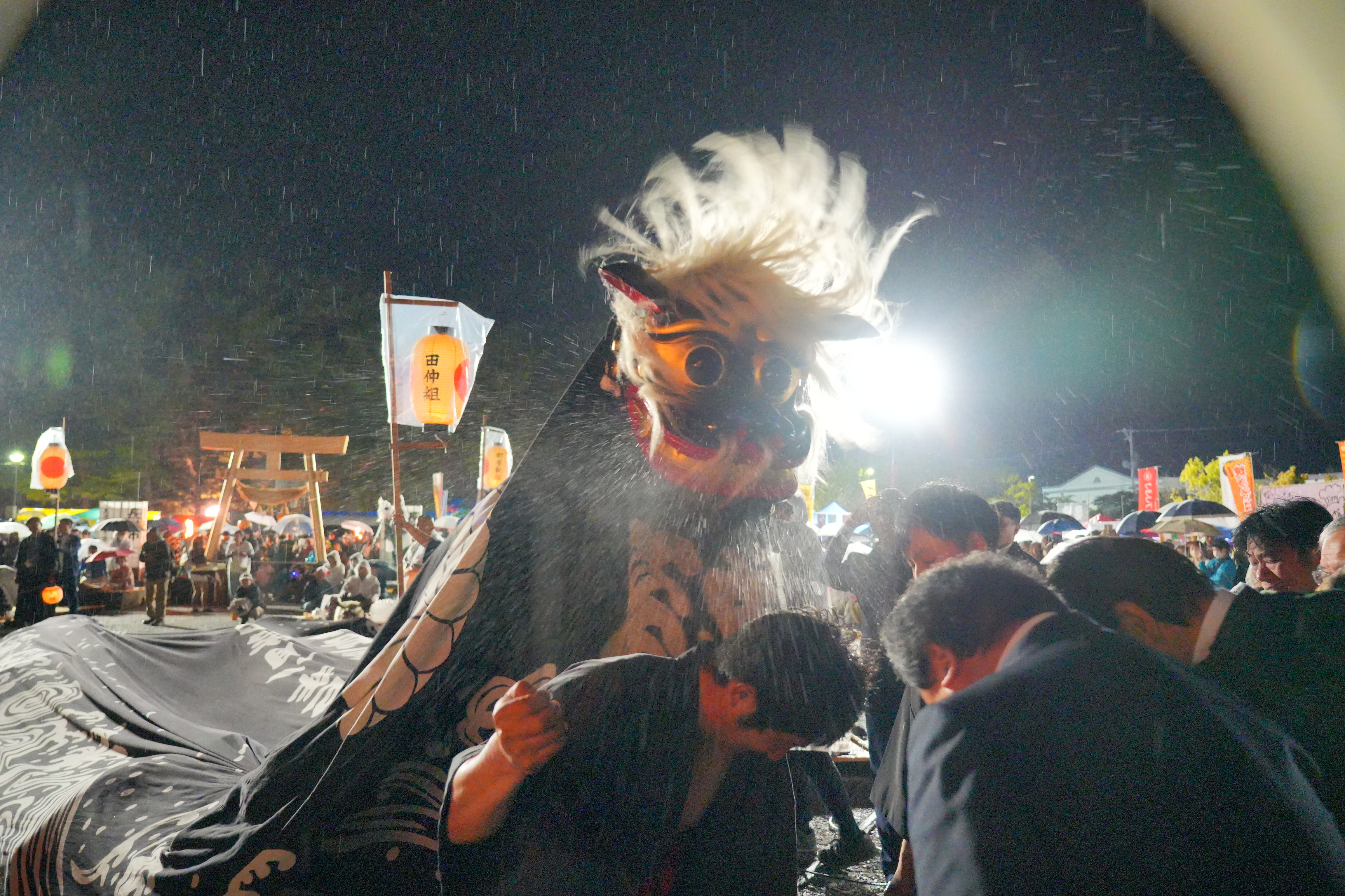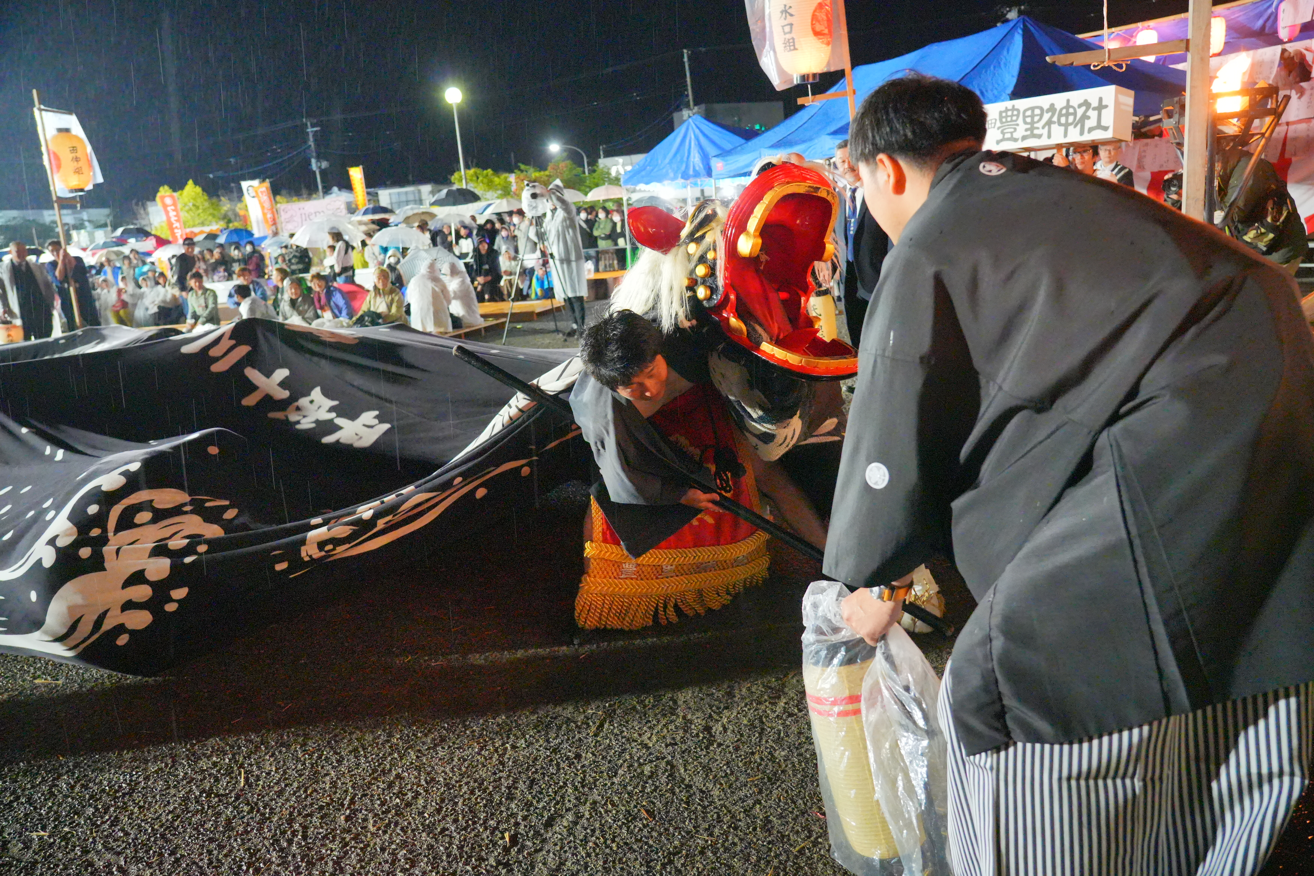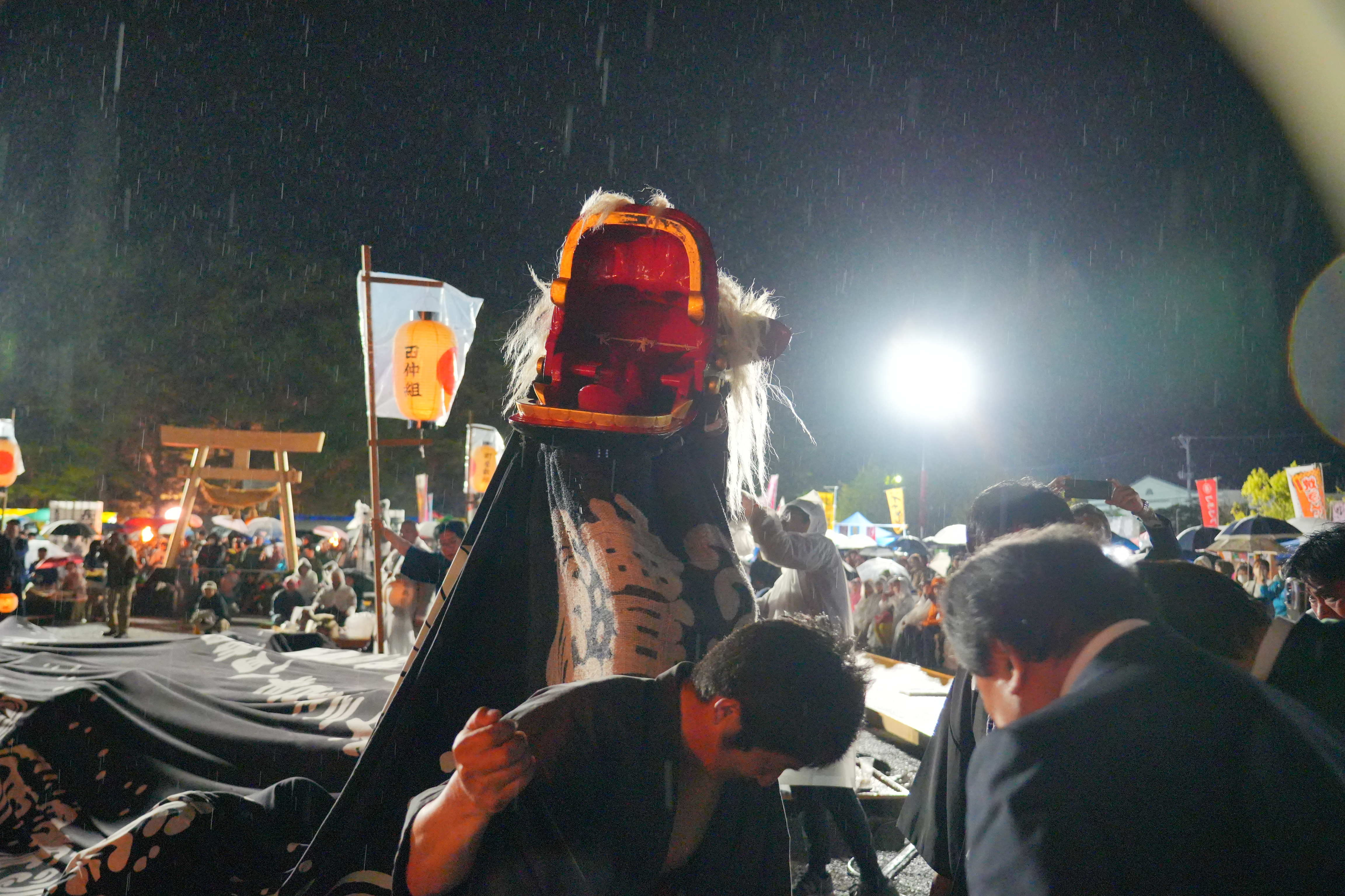 道中は、獅子が先導し、獅子宿(獅子がお休みする家の庭)まで行くと、御輿が先に納められる。