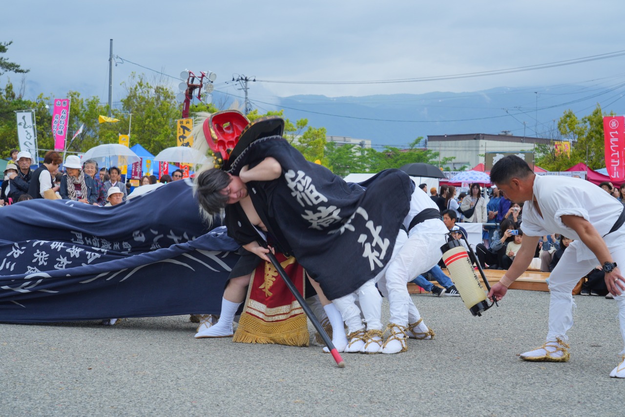 境内で舞う獅子舞で、顎を引いてにらみをきかす勇壮な姿、警固掛かりの時に獅子の足が4本警固の足にからみついて格闘する姿は他では見られない。