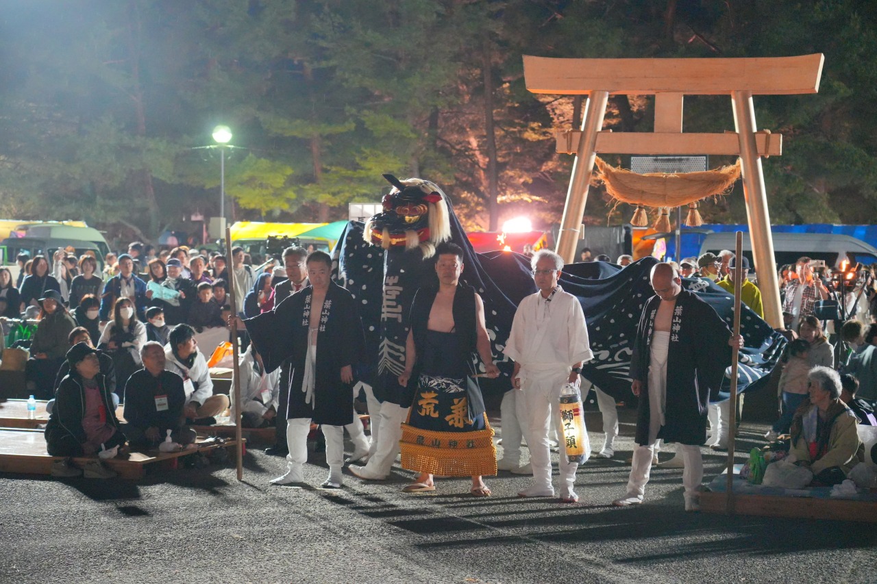 元々は、古代山嶽信仰の山の神として、また作神様として葉山山頂に祀られ、葉山権現とも称されていた。その後、現在地に勧請された。また、葉山山頂には葉山宮と月山宮の2社が祀られており、20年に一度の「お建て替え」を行い、現在まで続いている。「白兎」という地名も世界で唯一。巻眉の大きな獅子頭で、角力、警固に向かう時に顎を下げ、頭を回転しながら望み、勇壮な格闘が特徴。