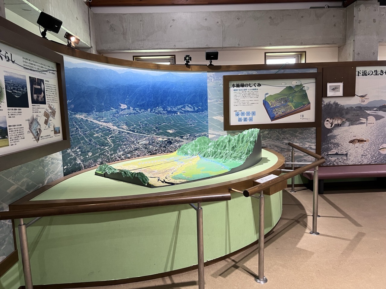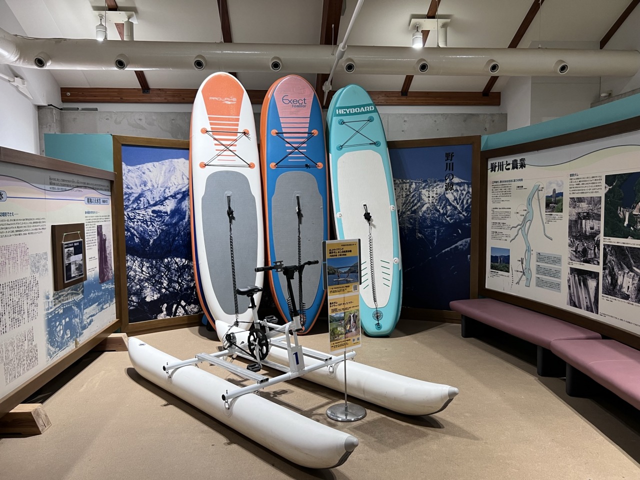 展示室では置賜野川周辺の自然や歴史、長井市の水に関する伝説の展示等を行っています。ホールではお弁当を食べたり、本を読んだりするなど自由にご利用いただけます。体験メニューは野川まなび館のホームページで紹介していますのでそちらをごらんください。