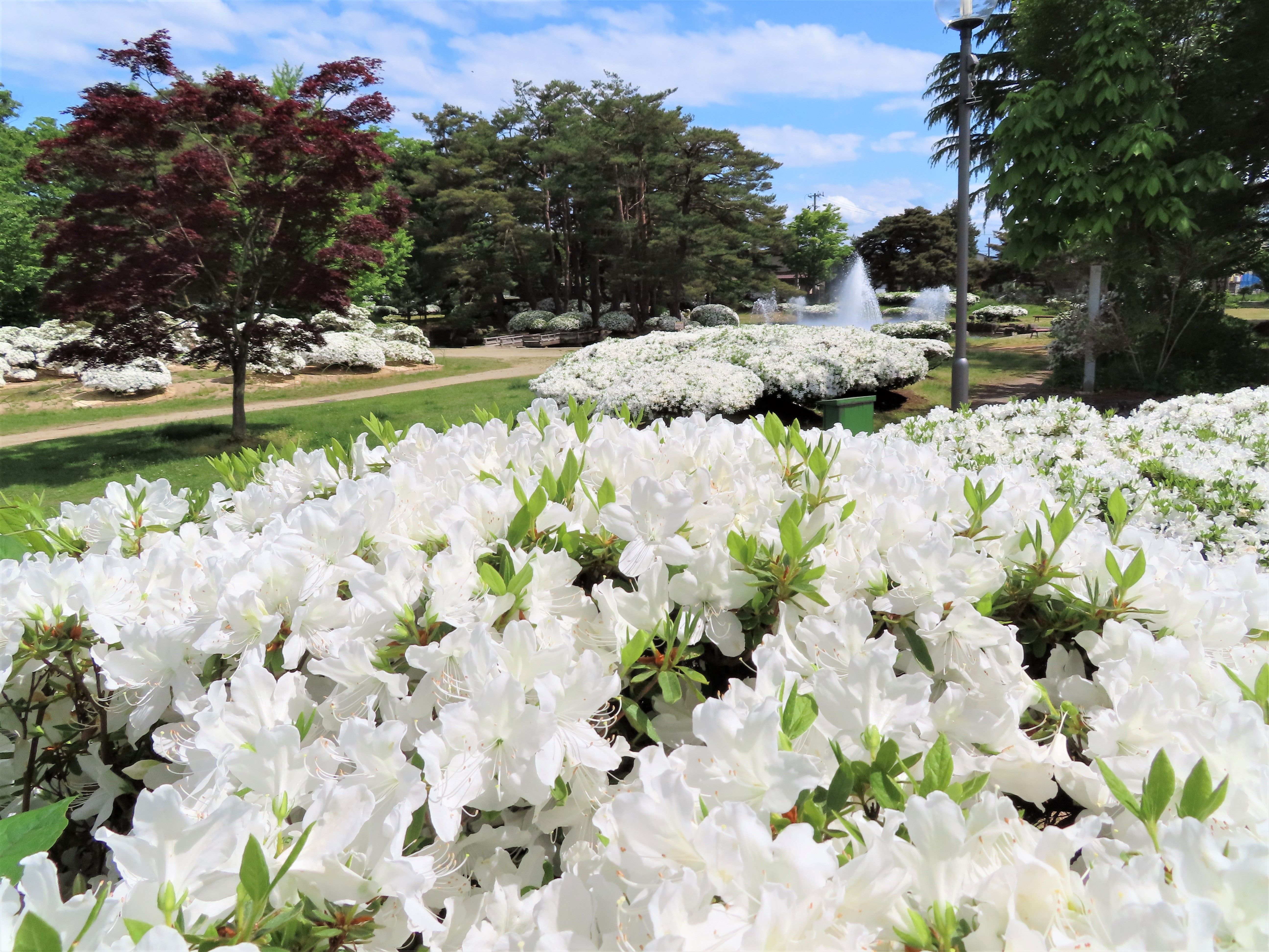 琉球種白つつじ約3000株が咲き誇る、長井を代表する花公園のひとつで、5月の満開時には一面純白の世界が広がり、まるで雪が降り積もったかのようになります。園内中心部には樹齢750年と伝わる「七兵衛つつじ」と呼ばれる古木のつつじ群もあり、市の天然記念物に指定され、風格の漂うその姿は必見です。冬の雪囲い作業は冬の訪れを知らせる季節の風物詩ともなっています。