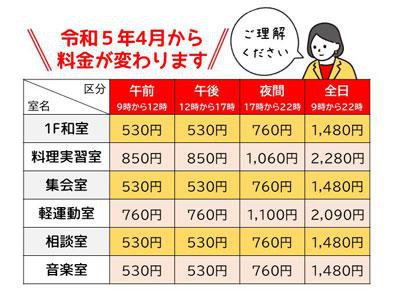 令和5年4月から、1階和室、料理実習室、集会室、軽運動室、相談室、音楽室 の使用料が変わります。