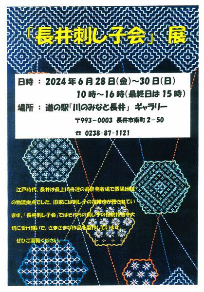 中央コミセンの学習ひろば自主教室「長井さしこ教室」で、指導・活動をしている 長井刺し子会のみなさんによる展示会が、6月28日(金)から6月30日(日)までの3日間、道の駅川のみなと長井で開催されます。