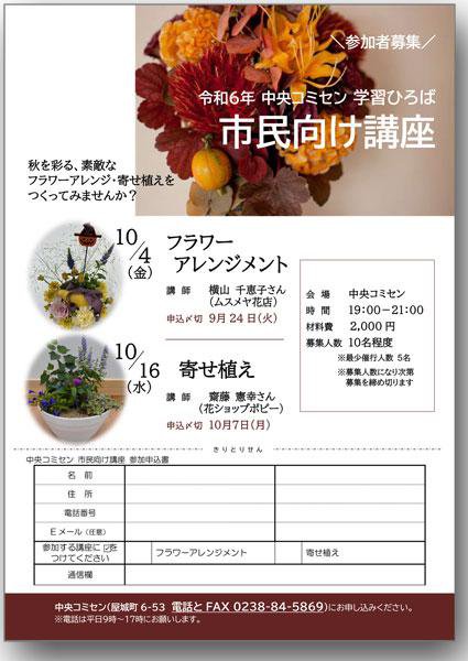 爽やかな秋を感じさせる「フラワーアレンジメント」と「寄せ植え」の講座を行います。初めての人も大丈夫! きれいな花や緑に癒されませんか?たくさんのご参加をお待ちしています。