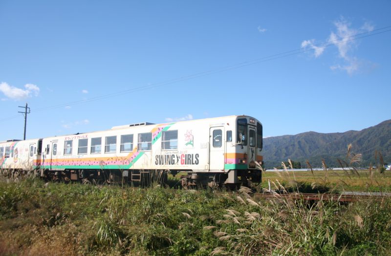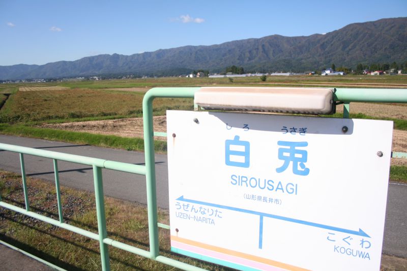 山形鉄道フラワー長井線白兎駅は、赤湯駅から下りで12つ目(約40分)、荒砥駅から上りで4つ目(約13分)の場所にある駅で平成元年に開業。のどかな田園の中にある単線の無人駅でホームに待合室があります。駅舎にはウサギのモチーフが描かれ、駅舎内には兎のモニュメントがあります。