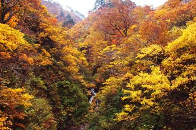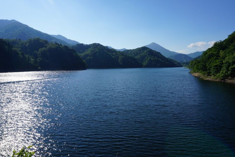 置賜野川本流の上流部に洪水調節、発電、農業用水の目的で建設され、昭和35年に竣工した県営ダムです。堤体の高さは46m、長さ168.2mと小規模ですが、中空重力式コンクリートと呼ばれる珍しいダムで、県内には蔵王ダムと二か所しかありません。清涼な水を湛えたダム湖には、東北のマッターホルンと称される祝瓶山の山容が映える絶景ポイントです。また湖水は野川第2発電所に導水されて発電に供されています。紅葉時は絶景です。