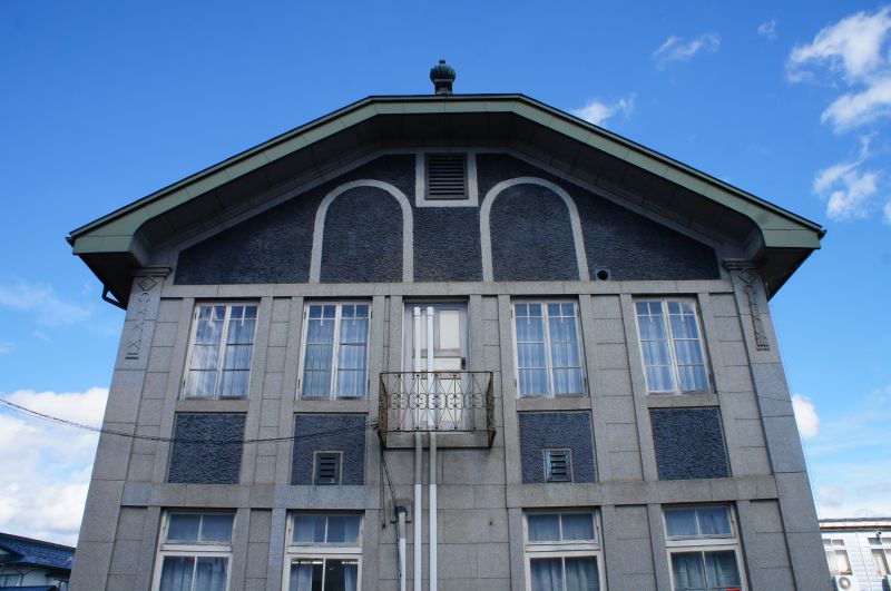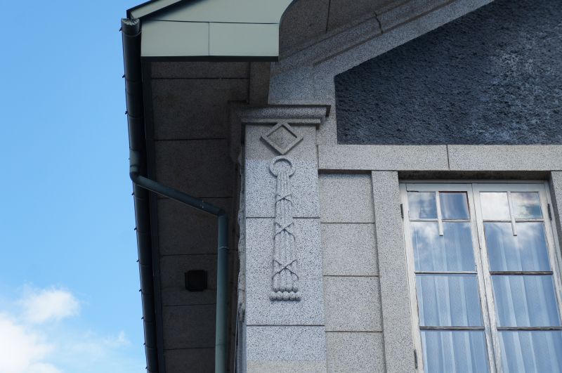 鉄筋コンクリート造りのように見えますが、石造りに似せた人造石洗い出しの外壁、ゴシック建築の名残の棟飾りやドーマウィンドウ(屋根喚起口)、バルコニー付玄関などの特徴があります。